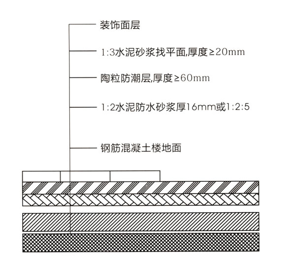 在清洗好的樓地面基層上找素水泥漿一道后,隨即抹防水砂漿,或用1:2.5水泥砂漿抹平后再做防潮層。拌制陶?;炷燎?,先用水濕潤陶粒,然后再摻入水泥拌合均勻,并嚴(yán)格控制用水量,以不淌漿能包裹陶粒表面為宜,且應(yīng)隨拌隨鋪。陶?;炷练莱睂尤缏裨O(shè)管道,其管道周圍應(yīng)先用水泥砂漿或細(xì)石混凝土固定穩(wěn)固后再鋪設(shè)。陶粒鋪設(shè)后應(yīng)用木赤分層趕平,木拍拍實,抹平至設(shè)計厚度和坡度。陶粒防潮層鋪設(shè)完成后應(yīng)注意養(yǎng)護(hù),養(yǎng)護(hù)期間嚴(yán)禁在表面上行走、操作、拖拉工具雜物等,并待期強(qiáng)度達(dá)到70%或至少三天后方可進(jìn)行下一道工序施工。